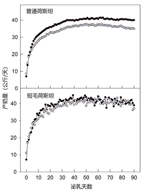 耐热短毛荷斯坦牛与普通荷斯坦牛在夏季(圆圈)和冬季(圆点)的产奶稳定性对比【2】。